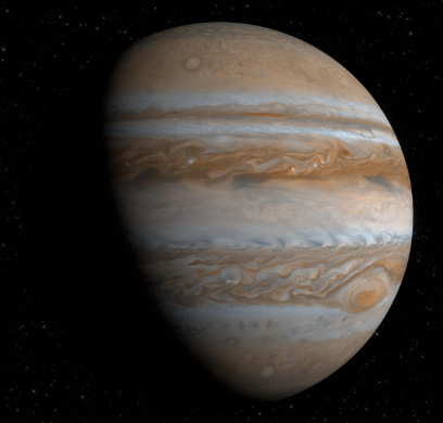 목성 대기에는 적도와 평행하게 위치한 검은 줄무늬와 밝은 줄무늬가 10여 개 번갈아 나타나는데, 이 줄무늬들은 목성 대기의 다양한 구름 띠를 형성하며 대기 순환과 역동적인 기상 변화를 보여줍니다. 목성 또한 토성 등과 같이 희미한 고리를 가지고 있습니다.